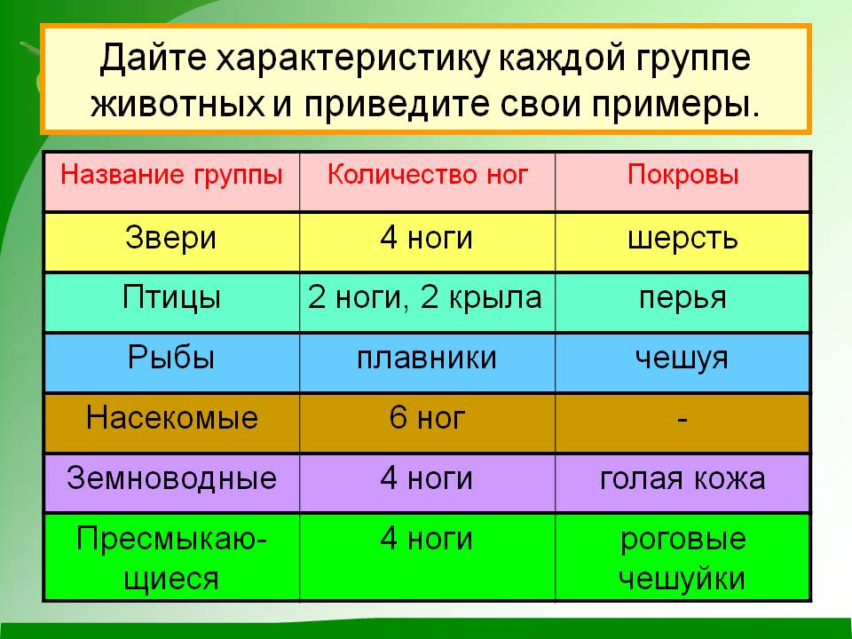 Дайте характеристику каждой группе животных и приведите свои примеры